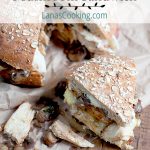 This delicious creation more than meets the “hearty” description. It’s downright decadent. A round boule of whole grain bread slathered with a garlic mayo combination and filled with bacon, sauteed chicken breast, brie, and caramelized onions and mushrooms. Yum. Yum.